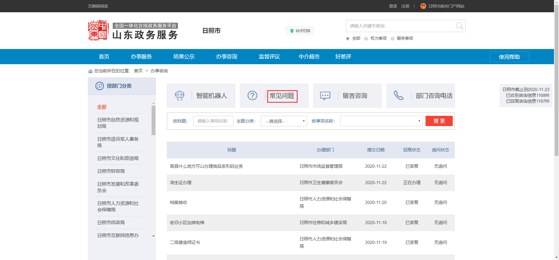 4.若常见问题中没有想要咨询的问题,返回“办事咨询”模块,在列表中查询是否之前已有相同问题咨询,在左侧“按部门分类”中查找该事项所在的部门,然后在该部门下查找具体问题,也可在事项名称框中直接输入问题进行查找。