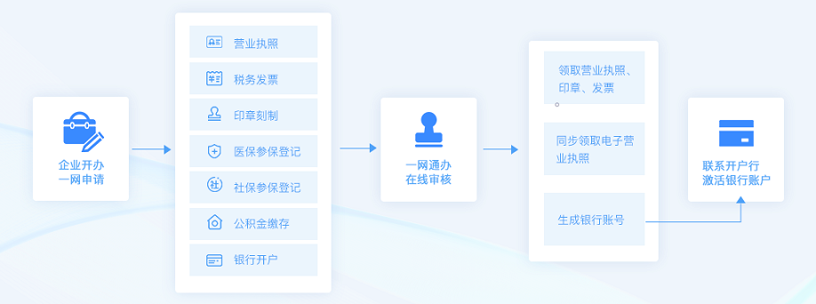 办理各类企业开办,包括申请营业执照的同时免费刻章、涉税事项、社保登记、医保单位参保登记、 住房公积金单位缴存登记、预约银行开户。