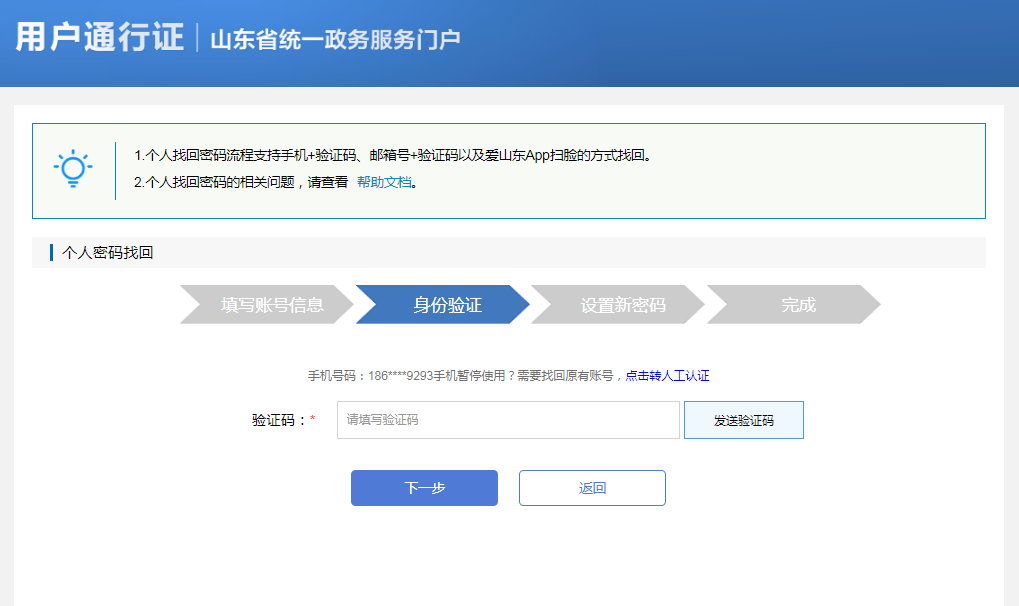3.在验证身份环节涉及到三种验证方式:手机号+验证码方式、邮箱+验证码方式、爱山东APP扫脸认证,用户可自由选择。