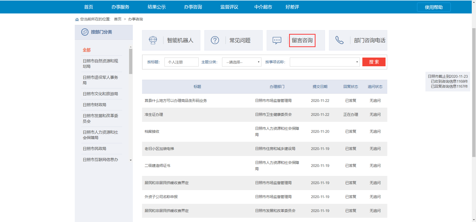 4.若常见问题中没有想要咨询的问题,返回“办事咨询”模块,在列表中查询是否之前已有相同问题咨询,在左侧“按部门分类”中查找该事项所在的部门,然后在该部门下查找具体问题,也可在事项名称框中直接输入问题进行查找。