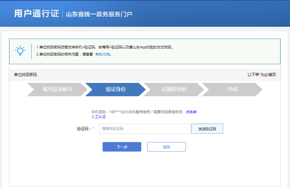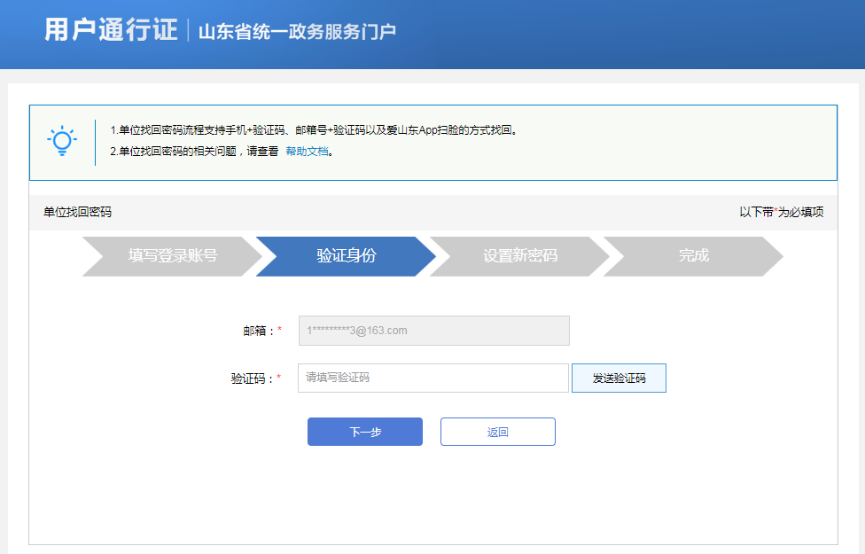 3.在验证身份环节涉及到三种验证方式:手机号+验证码方式、邮箱+验证码方式、爱山东APP扫脸认证,用户可自由选择。